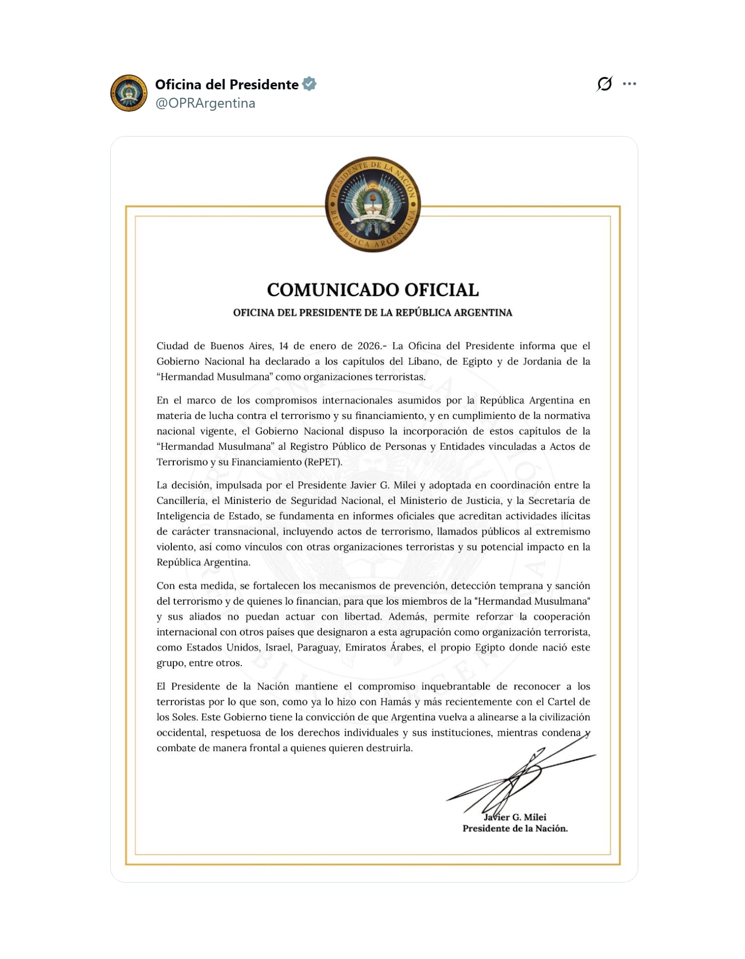 La República Argentina dio un paso en su política de seguridad internacional al declarar organización terrorista a la Hermandad Musulmana, en sus capítulos de Líbano, Egipto y Jordania. La medida, oficializada el miércoles 14 de enero por la Oficina del Presidente en la red social X y fundamentada en compromisos internacionales vigentes, determinó la incorporación del grupo al Registro Público de Personas y Entidades vinculadas a Actos de Terrorismo y su Financiamiento (RePET). El procedimiento fue impulsado por la Cancillería, con la intervención del Ministerio de Seguridad, el Ministerio de Justicia y la Secretaría de Inteligencia, quienes coordinaron la decisión en base a informes oficiales que evidencian actividades ilícitas transnacionales y conexiones con otras organizaciones terroristas.