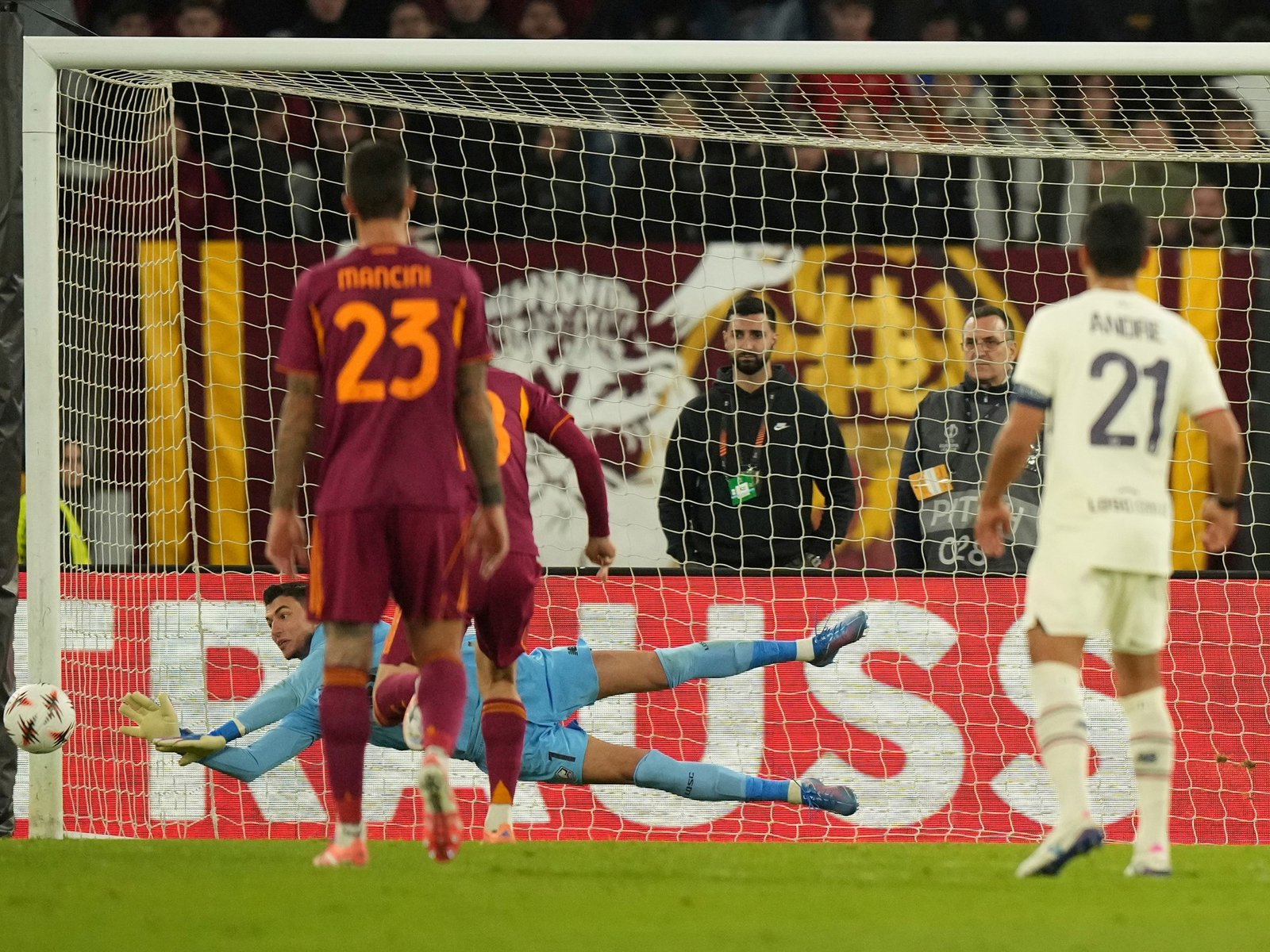Sin embargo, y tras otro llamado desde la cabina, se determinó que un jugador del Lille invadió el área, por lo que se volvió a patear el tiro desde los 12 pasos. El ucraniano tuvo una nueva oportunidad para poner el 1-1, pero Ozer le adivinó el disparo, el cual fue al mismo lugar. A pesar de esto, el uno de los franceses se adelantó, por lo que la Roma se encontró con otra chance para empatar.