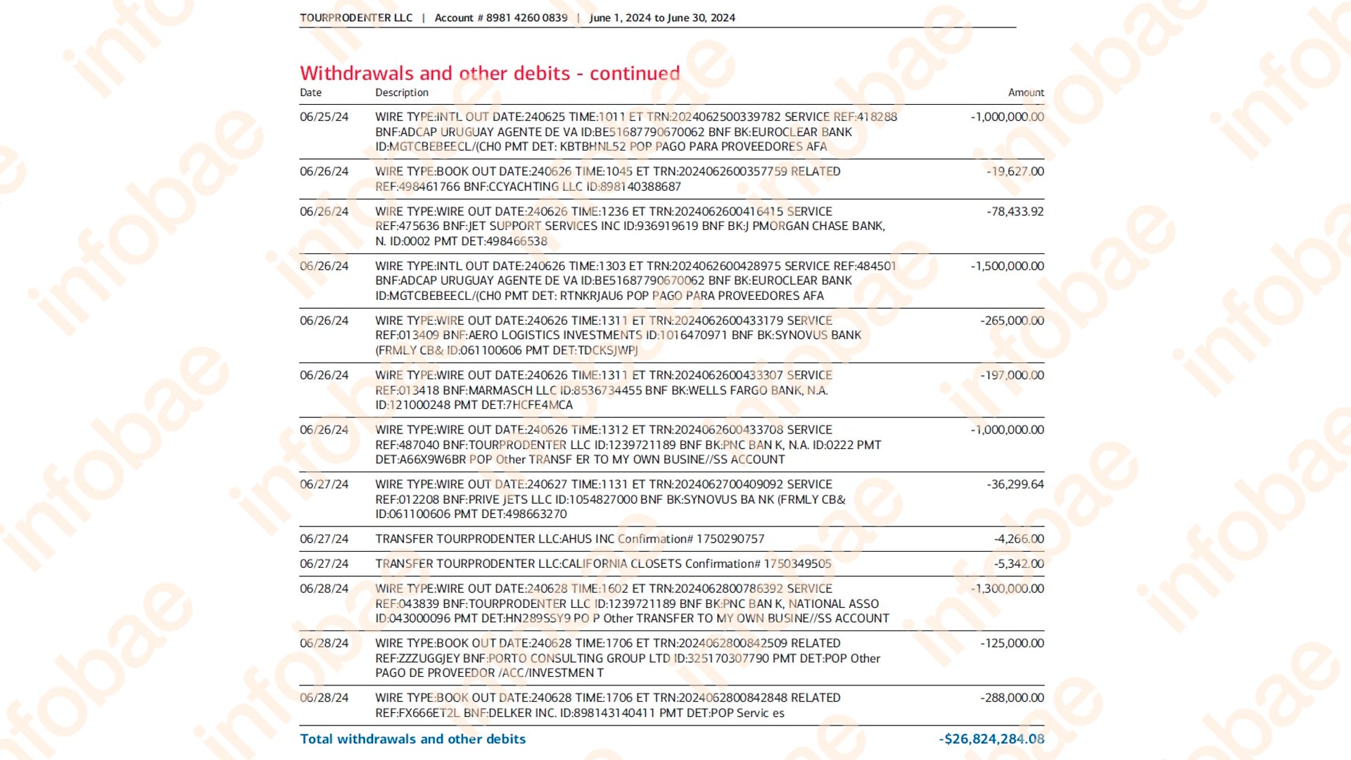 El 22 de noviembre de 2023, una cuenta de TourProdEnter pagó USD 38.500 a un proveedor de aviación privada. El 15 de enero de 2024, otra transferencia por USD 27.000 fue enviada a un proveedor vinculado a embarcaciones. En ninguno de los casos los conceptos permiten asociar esos gastos a actividades deportivas.