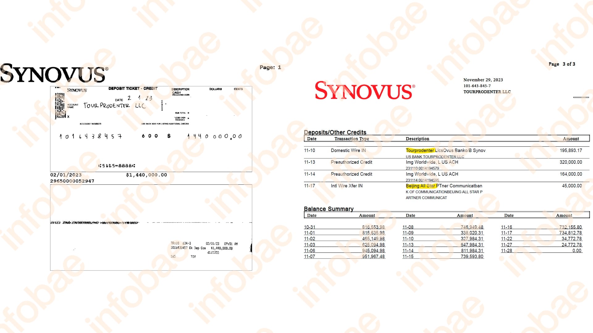 El patrón se mantiene en los meses siguientes. El 14 de septiembre de 2023, otra transferencia por USD 4.200.000 ingresó a una cuenta de TourProdEnter en Synovus Bank, con Citibank como corresponsal. En noviembre de 2023, se registra un ingreso adicional por USD 6.100.000, cursado a través de Bank of America bajo el concepto sponsorship payment.