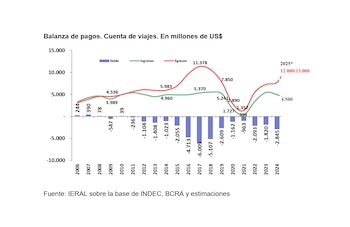 Durante 2025, la actividad turística de Argentina enfrentó un escenario de déficit internacional comparable al registrado en 2017. Según el último informe de IERAL de Fundación Mediterránea, la dinámica de los viajes mostró que el saldo del año refleja que en los primeros 11 meses viajaron 11,2 millones de turistas residentes al exterior, mientras que solo ingresaron al país 4,8 millones de turistas internacionales. De este modo, el saldo neto fue de 6,4 millones de viajeros, cifra alineada con el desbalance de viajeros observado en 2017.
