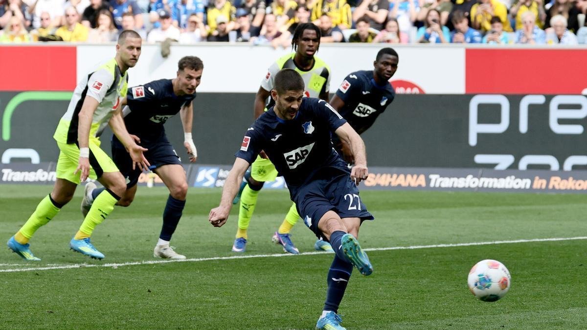 El lanzamiento de Kramaric, con su derecha, a la izquierda del portero, supuso el 1-0 para el Hoffenheim en el minuto 42. Por más que adivinó el lado y se estiró Gregor Kobel, no llegó a alcanzarlo. Antes ya se había librado el Dortmund de dos goles en contra. Primero, porque una volea de Lemperle botó y se estrelló contra el larguero. Después, porque el portero desbarató otra oportunidad del delantero, activo durante todo el primer tiempo.