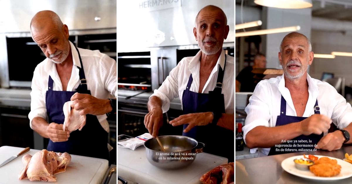 El chef publicó una historia preparando una milanesa de pollo a la parmesana, enfundado en un delantal azul y camisa blanca. Durante la elaboración de la receta, explicó que utiliza pollo de Entre Ríos, afirmando que “es un pollo bien criado, con muchísimo sabor”. Destacó la relevancia de la huevada, como se llama el baño de huevo previo al empanado, recomendando calcular un huevo y medio por milanesa para que la carne absorba los aromas.
