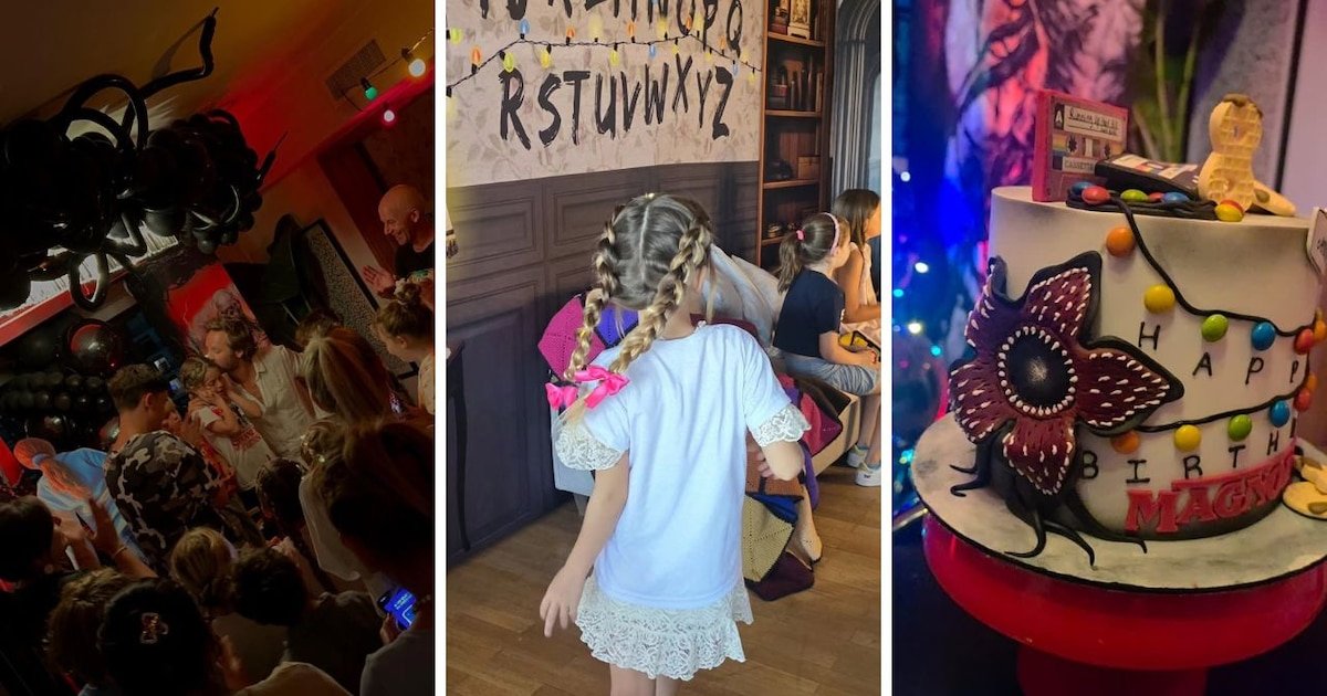 El corazón del festejo, sin embargo, estuvo en el grupo de niños: las imágenes mostraban a Magnolia rodeada de sus amigos, todos en traje de baño, remeras y ropa cómoda, posando entre globos, decoraciones y figuras gigantes de Stranger Things. Los chicos, desinhibidos y felices, adoptaron poses y gestos inspirados en la serie, sumando alegría y complicidad a la escena.