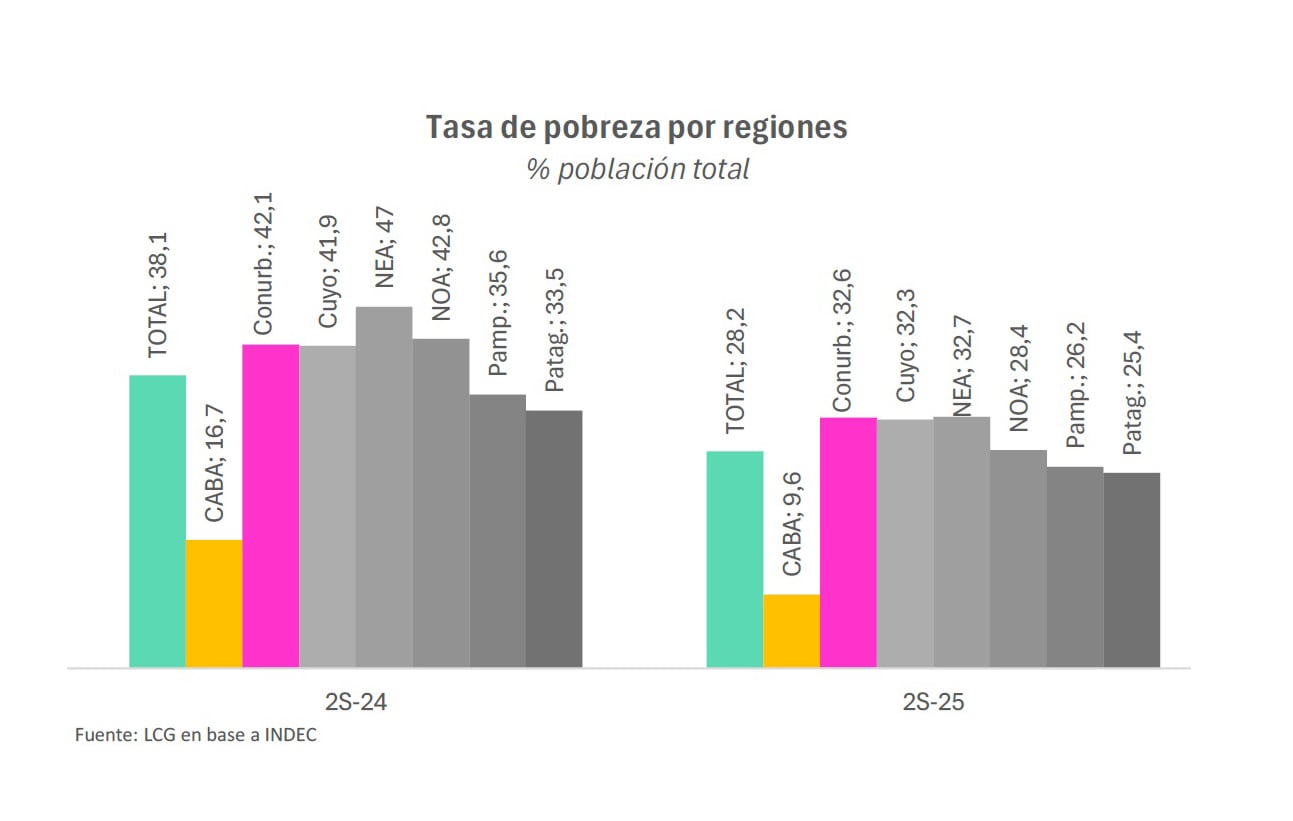 La mejora registrada hacia finales de 2025, que llevó la pobreza al 28,2% y la indigencia al 6,3%, no fue uniforme en todo el territorio ni en todas las franjas etarias. LCG destaca que, si bien hubo reducciones importantes en el NOA y el NEA, estas regiones mantienen tasas por encima del 32%. El Conurbano bonaerense, por su parte, presenta la segunda mayor tasa de pobreza del país (32,6%) y concentra más del 50% de los pobres totales.