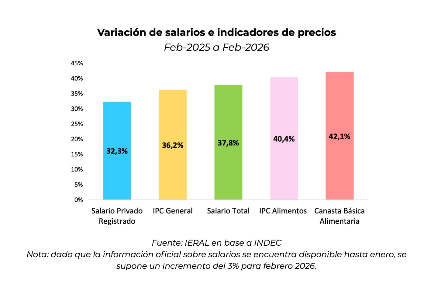 Al observar el comportamiento anualizado a febrero de 2026, el informe detalla que los salarios del sector privado registrado aumentaron un 32,3%, quedando por debajo de la inflación general, que fue del 36,2%. Sin embargo, la disparidad es más aguda al comparar los ingresos con los bienes esenciales: el incremento salarial quedó “considerablemente por detrás del aumento en los precios de los alimentos (40,4%) y de la canasta básica alimentaria (42,1%) en el mismo periodo”. Esta brecha indica que, aunque los salarios totales mostraron un crecimiento del 37,8%, este dinamismo no alcanza para compensar el encarecimiento de la CBA.