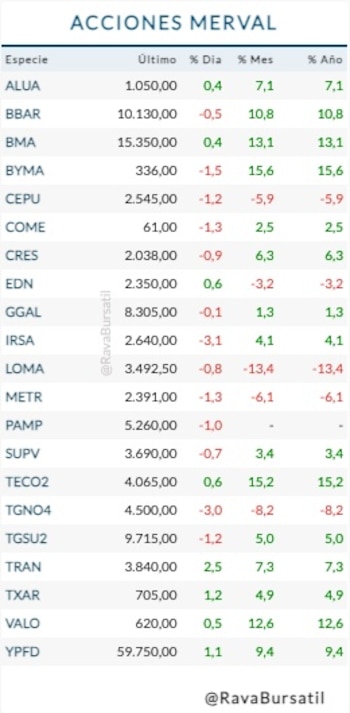 “En el sector energético, Vista Energy mantiene fundamentos sólidos pese a la volatilidad del crudo, mientras que el sector bancario, representado por Grupo Galicia, enfrenta dificultades para superar resistencias por análisis técnico”, comentaron los analistas de Rava Bursátil.