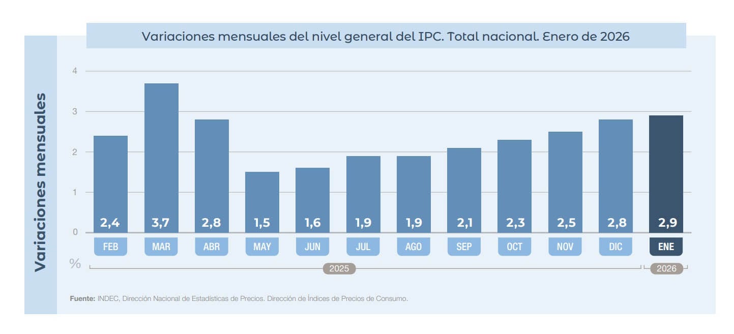 En detalle, el índice del Indec aceleró en junio de 2025 (1,6%), julio (1,9%), agosto (1,9%), septiembre (2,1%), octubre (2,3%), noviembre (2,5%), diciembre (2,8%) y enero de 2026, cuando llegó a rozar el 3%, con una variación del 2,9 por ciento.