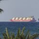 A ship is seen passing through the Strait of Hormuz during a two-week ceasefire between the United States and Iran on April 8, 2026. (Shady Alassar/Anadolu/Getty Images)