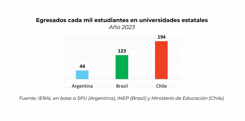 Desde la perspectiva del equilibrio fiscal, el peso de la educación superior también se analiza bajo la lupa de la eficiencia y la equidad distributiva. El informe señala una brecha significativa entre los recursos invertidos y los resultados académicos obtenidos. En el año 2023, apenas el 4,4% de los estudiantes del sistema universitario nacional lograron graduarse. Esto es, 1 de cada 22, relación notablemente inferior a la de otros países de la región. Mientras que Argentina produce 44 graduados por cada 1.000 estudiantes, Brasil alcanza los 123 y Chile llega a los 194, casi el triple y más del cuádruple, respectivamente.