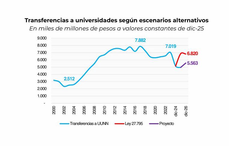 De esta manera, se plantean dos escenarios diferentes. Si se aplica la Ley 27.795, las transferencias a universidades en 2026 alcanzarían 6,8 billones de pesos a precios de diciembre 2025, suponiendo inflación prevista en el presupuesto (0,76% del PIB). En cambio, de aplicarse el Proyecto, se alcanzaría un gasto por transferencias a universidades nacionales de 5,5 billones de pesos (0,53% del PIB).