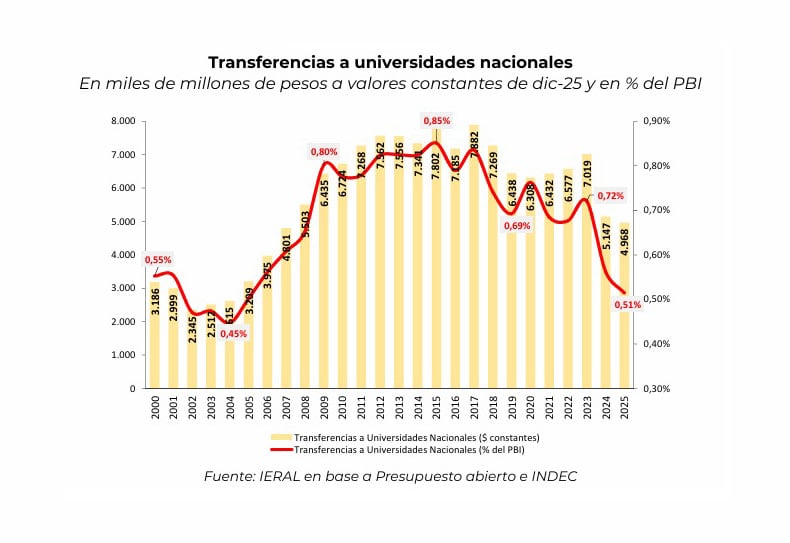 Para comprender el peso relativo de la educación superior en el presupuesto, resulta necesario observar la participación de estas partidas respecto al Producto Interno Bruto (PIB). Según los datos procesados por el Ieral, el financiamiento universitario alcanzó un pico histórico en el año 2015, cuando representó el 0,85% del PIB. Entonces se inició una tendencia decreciente que se acentuó en los últimos dos años. Para el cierre de 2024, el gasto en universidades nacionales se ubicó en el 0,53% del PIB, y las proyecciones para el año 2025 sitúan esta cifra en el 0,51%. Este nivel de inversión guarda similitud con los registros de principios de siglo, marcando un retorno a niveles de participación estatal que habían sido superados hace más de una década.