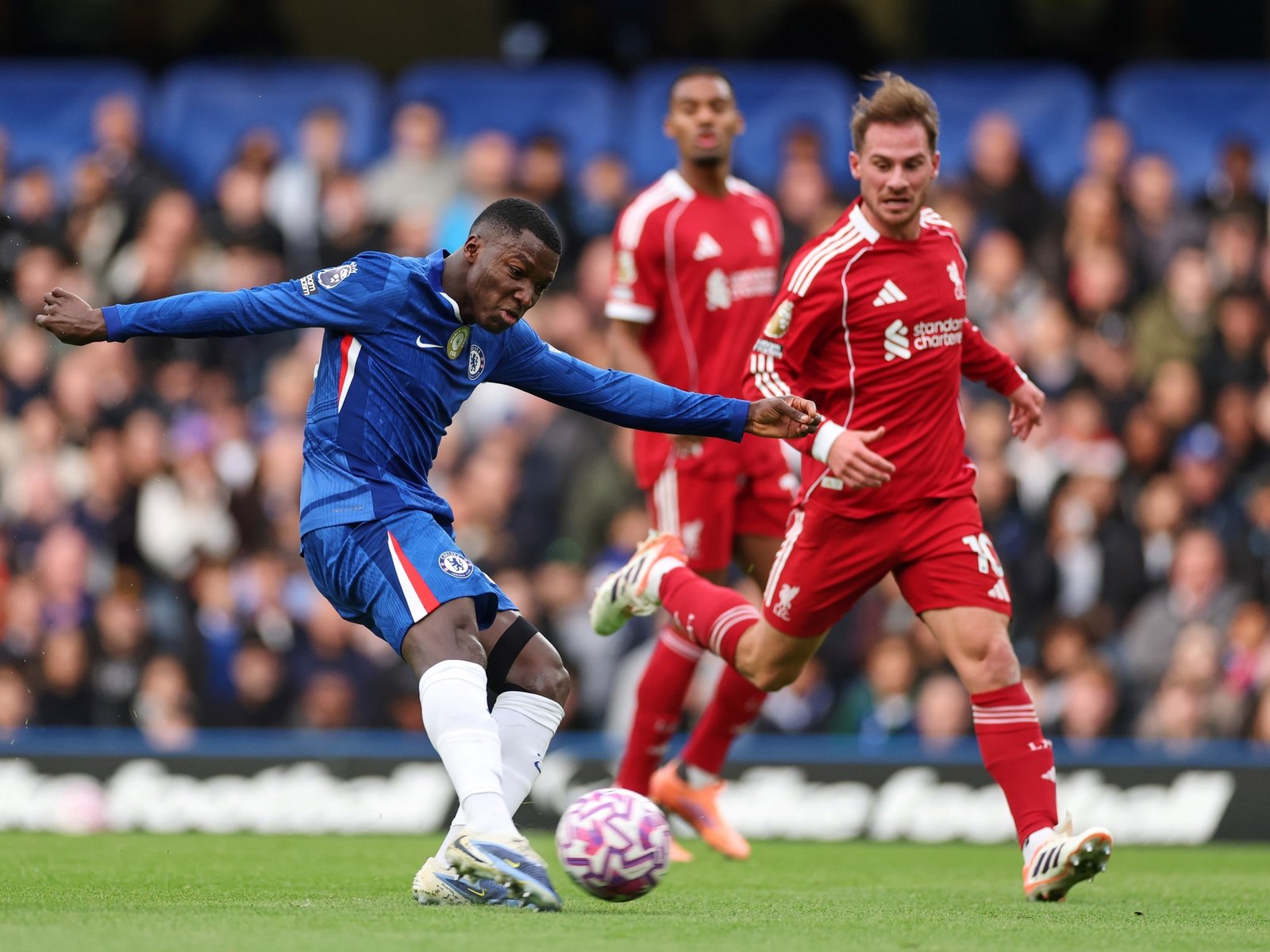 Stamford Bridge pesó a favor de los Blues en el inicio, que comenzaron considerablemente mejor. El negocio parecía estar a la espalda de Connor Bradley, lateral derecho de los Reds, sector que atacó con éxito en reiteradas ocasiones Garnacho. El argentino redondeó un buen primer tiempo, donde fue de menos a más, volvió loco a su marcador y terminó incluso siendo de lo más peligroso de su equipo.
