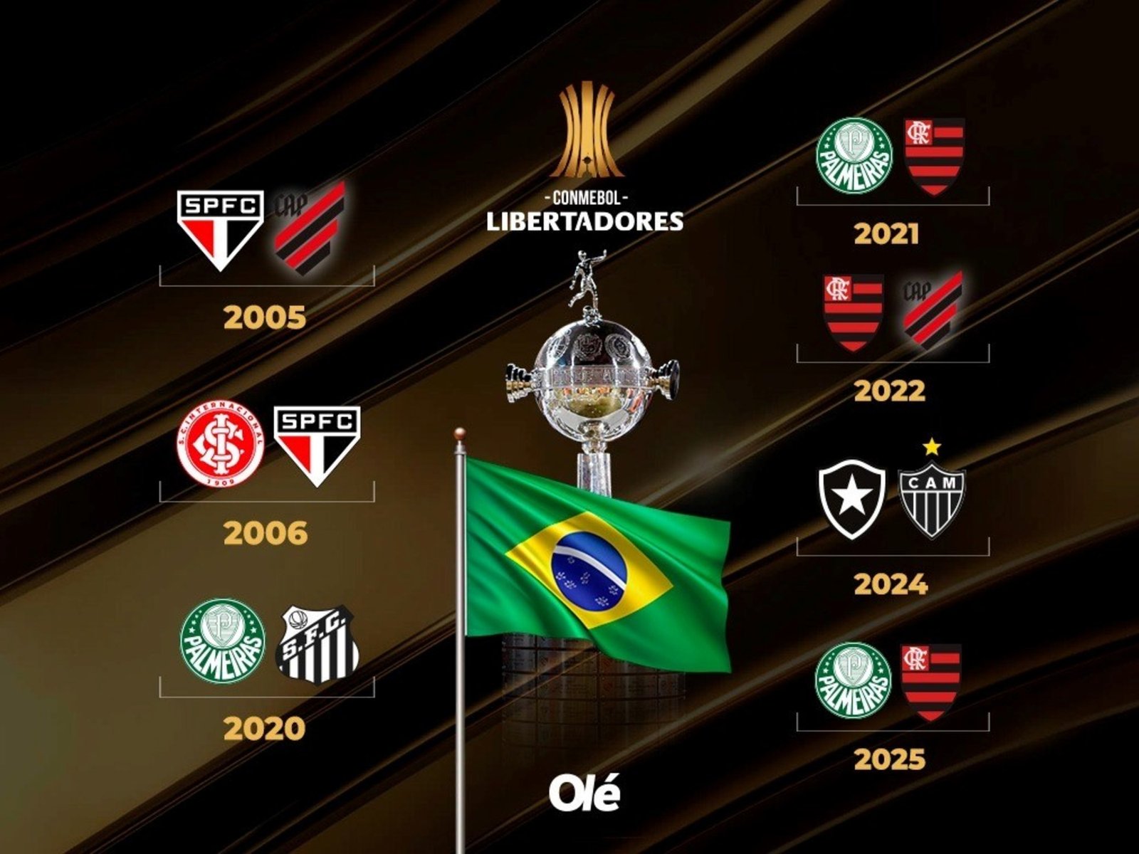 Hubo que esperar hasta 2020 para volver a ver un duelo brasileño en la instancia decisiva. Esa vez, Palmeiras venció 1-0 a Santos en un Maracaná vacío por la pandemia con un gol agónico de Breno Lopes.