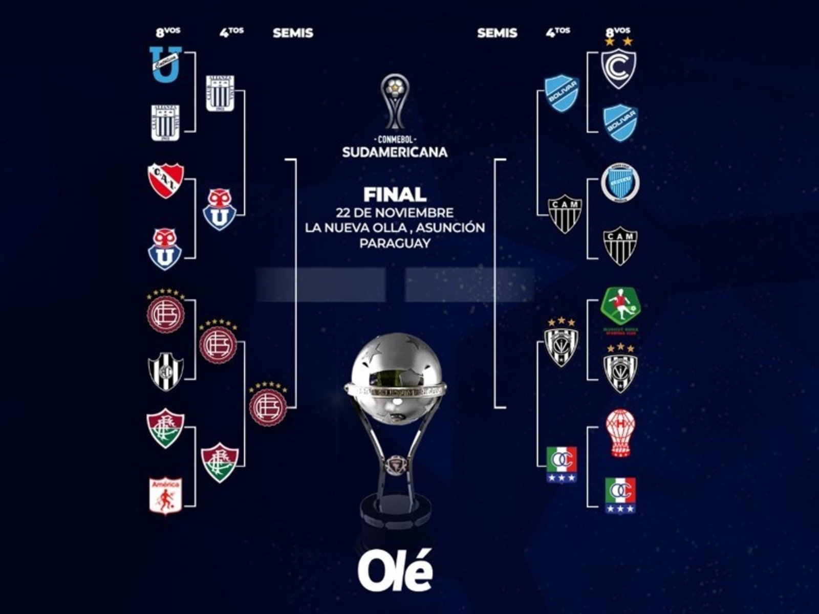 Este miércoles, por su parte, quedarán definidos los otros dos equipos que disputarán la otra semifinal. Primero, Atlético Mineiro recibirá a Bolívar después del 2-2 en La Paz. En el segundo turno, Once Caldas espera por Independiente del Valle tras el 2-0 que logró en Ecuador.
