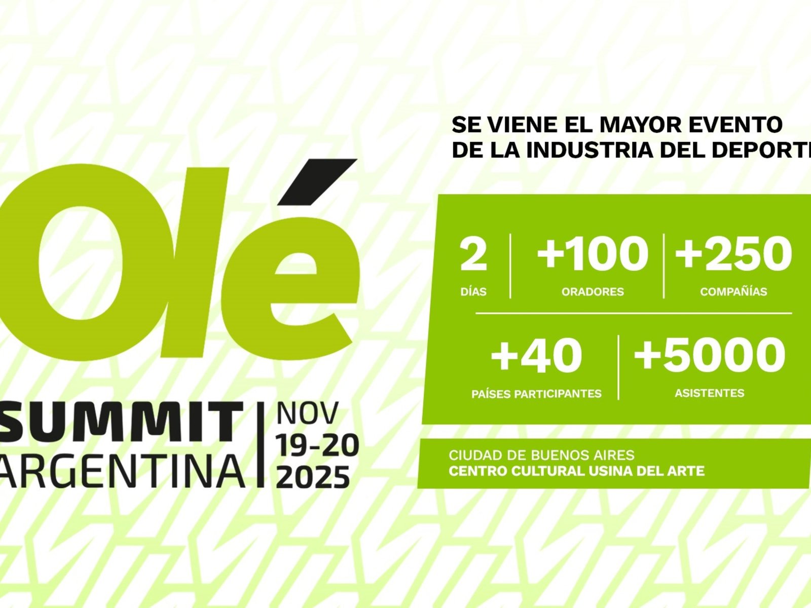 La Usina del Arte, ícono cultural de la Ciudad de Buenos Aires, será el escenario perfecto para albergar esta experiencia. Historia, arquitectura y modernidad para dos días de contenidos de alto impacto, con acceso tanto presencial como digital. En la cuenta regresiva del evento, en Olé iremos anunciando temáticas y speakers, argentinos y del exterior. Para seguir enriqueciendo este evento top argentino.