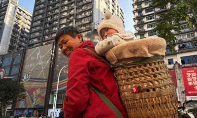 A caregiver carries a baby in a woven basket in China as the government rolls out new tax and social policies aimed at encouraging families to have more children amid a population decline. (Cheng Xin/Getty Images)