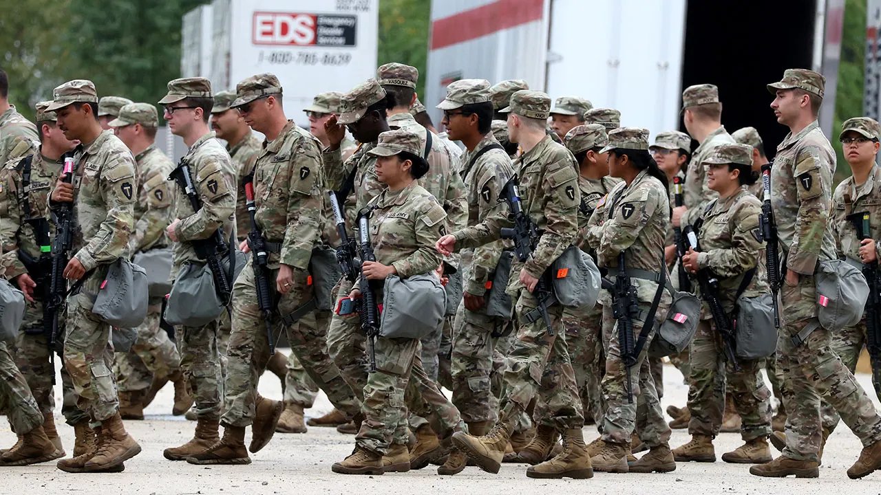 Members of the Texas National Guard assemble in Elwood, Illinois, at the Army Reserve Training Center in the southwest suburb of Chicago, on Oct. 7. 2025. The Trump administration on Wednesday said it will remove National Guard troops from Chicago, Los Angeles and Portland, Oregon. (Brian Cassella/Chicago Tribune/Tribune News Service via Getty Images)