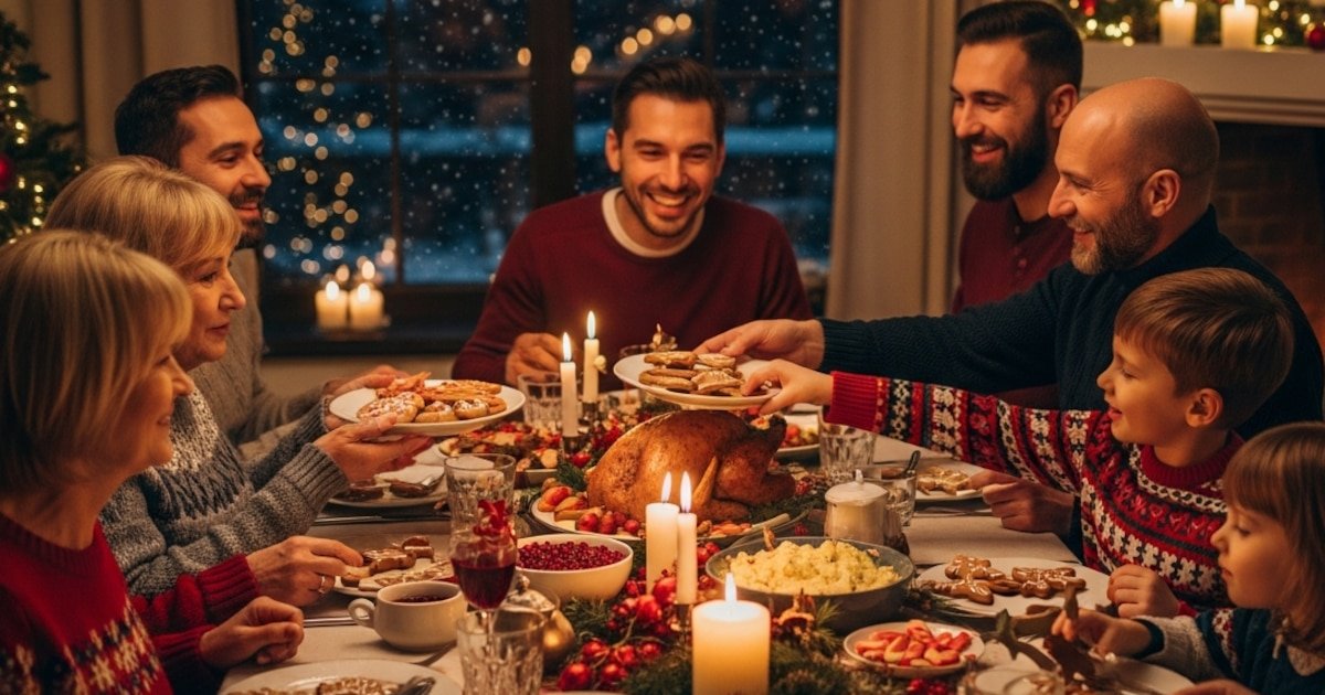 Navidad,familia,cena,celebración,unión,tradición,invierno,chimenea,árbol de Navidad,comida,postres,galletas,velas,alegría,reunión familiar