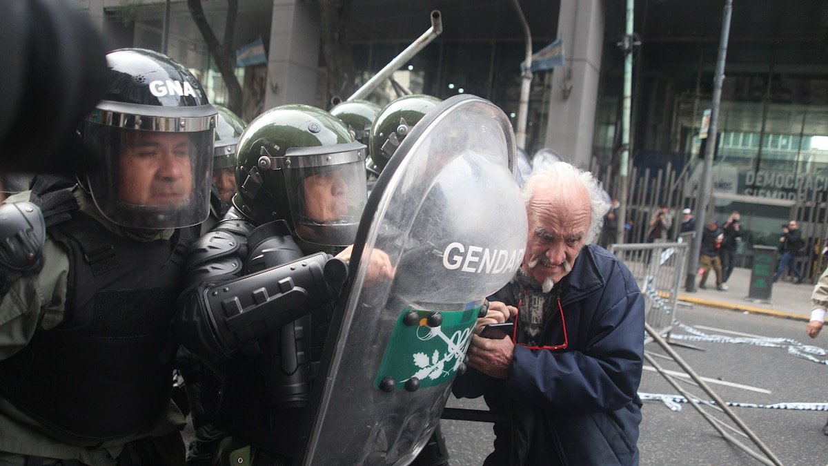 Hubo varios enfrentamientos y la marcha terminó con una treintena de heridos, entre ellos ocho periodistas. Bullrich se mostró monitoreando el operativo. Pietragalla la denunció en los tribunales de Comodoro Py 2002 por apremios ilegales y abuso de autoridad.