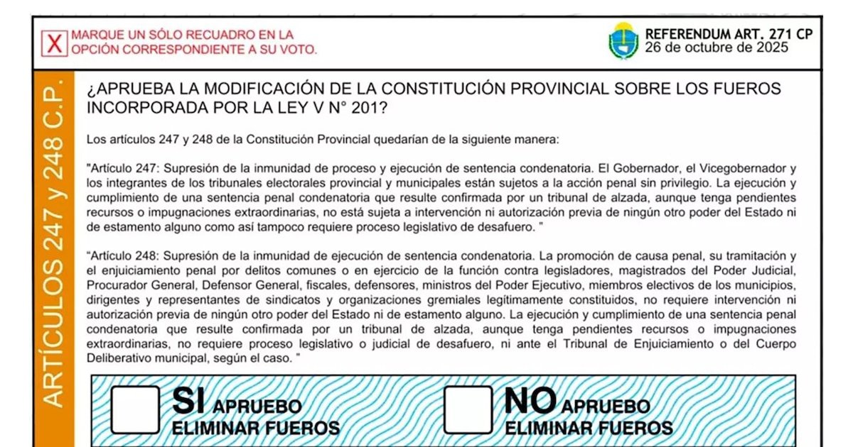 “¿Aprueba la modificación de la Constitución provincial sobre los fueros incorporada por la Ley V N° 201?”, dice en mayúsculas el encabezado de la boleta del referéndum, y al pie incluye dos casilleros para tildar la respuesta del votante, por el SÍ o el NO.