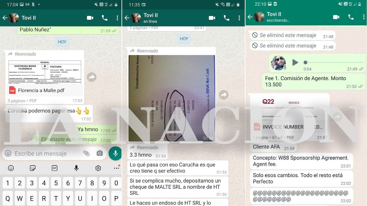 Pablo Toviggino actuaba como si fuera uno de los dueños de la empresa que le compró la mansión de Pilar a Carlos Tévez, Malte SRL. Según una serie de capturas de chats a los que accedió , el tesorero de la AFA gestionaba el manejo de los cheques de esa empresa y hasta se ocupaba que le paguen a tiempo las facturas de su pareja, María Florencia Sartirana. Los mensajes también revelan que Toviggino tuvo un rol activo en la confección de facturas emitidas por una de las empresas “intermediarias” que recaudó los fondos de la AFA en el exterior hasta diciembre de 2021.