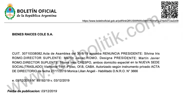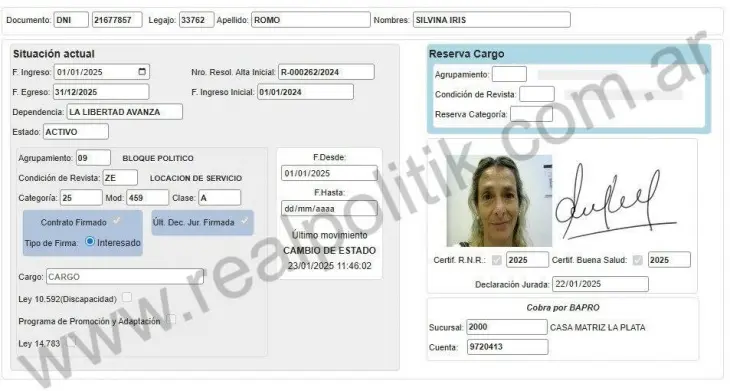 En tanto, Silvina Iris Romo, además de su contratación estatal, mantiene vínculos con al menos dos empresas familiares: Cotivo SA y Bienes Raíces Cole SA.