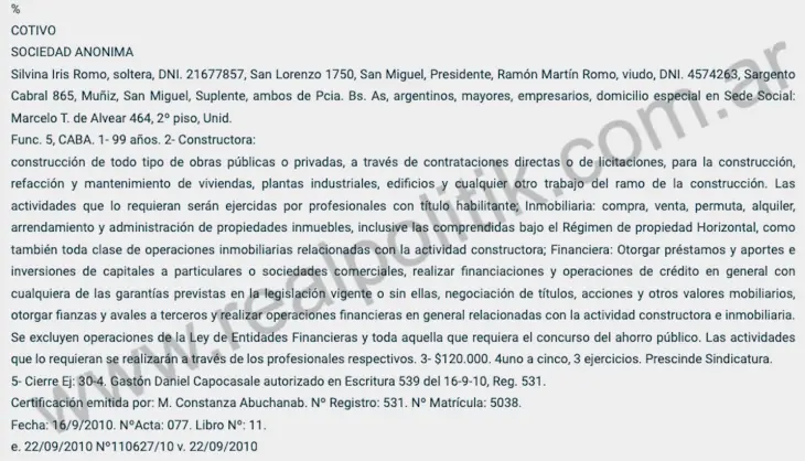 La primera, Cotivo SA, está registrada como constructora, inmobiliaria y financiera, con domicilio especial en la Ciudad Autónoma de Buenos Aires y es presidida por la propia Silvina. Según su objeto social, se dedica a obras públicas y privadas, administración de propiedades y hasta préstamos y avales financieros, siempre al margen del sistema bancario formal.