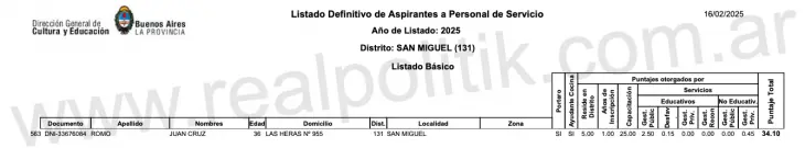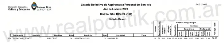 No es la primera vez que Juan Cruz Romo aparece en la estructura estatal. Según pudo reconstruir este medio, su nombre figura desde hace años en los listados de aspirantes a personal de servicio de la dirección General de Cultura y Educación de la provincia de Buenos Aires, bajo el ala del gobierno de Axel Kicillof. Paradójicamente, Romo acumula experiencia en áreas como portería y cocina escolar, según documentación oficial.