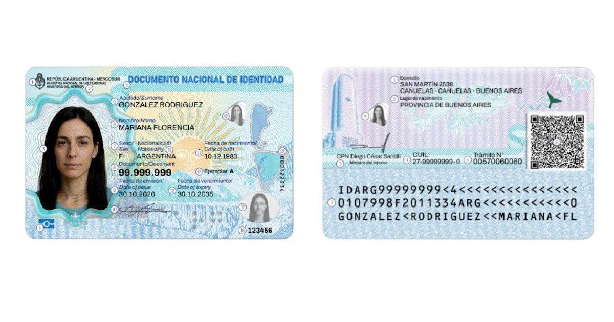 De la misma manera, indicaron que en el dorso se coloque la información del domicilio, el lugar de nacimiento, la firma del Ministerio del Interior, el número de CUIL, el número de trámite, un código QR, una zona de lectura mecánica y una imagen fantasma de la persona. Salvo para los ciudadanos extranjeros, que deberán sumar su país de nacimiento, el número de juzgado y la fecha de naturalización.