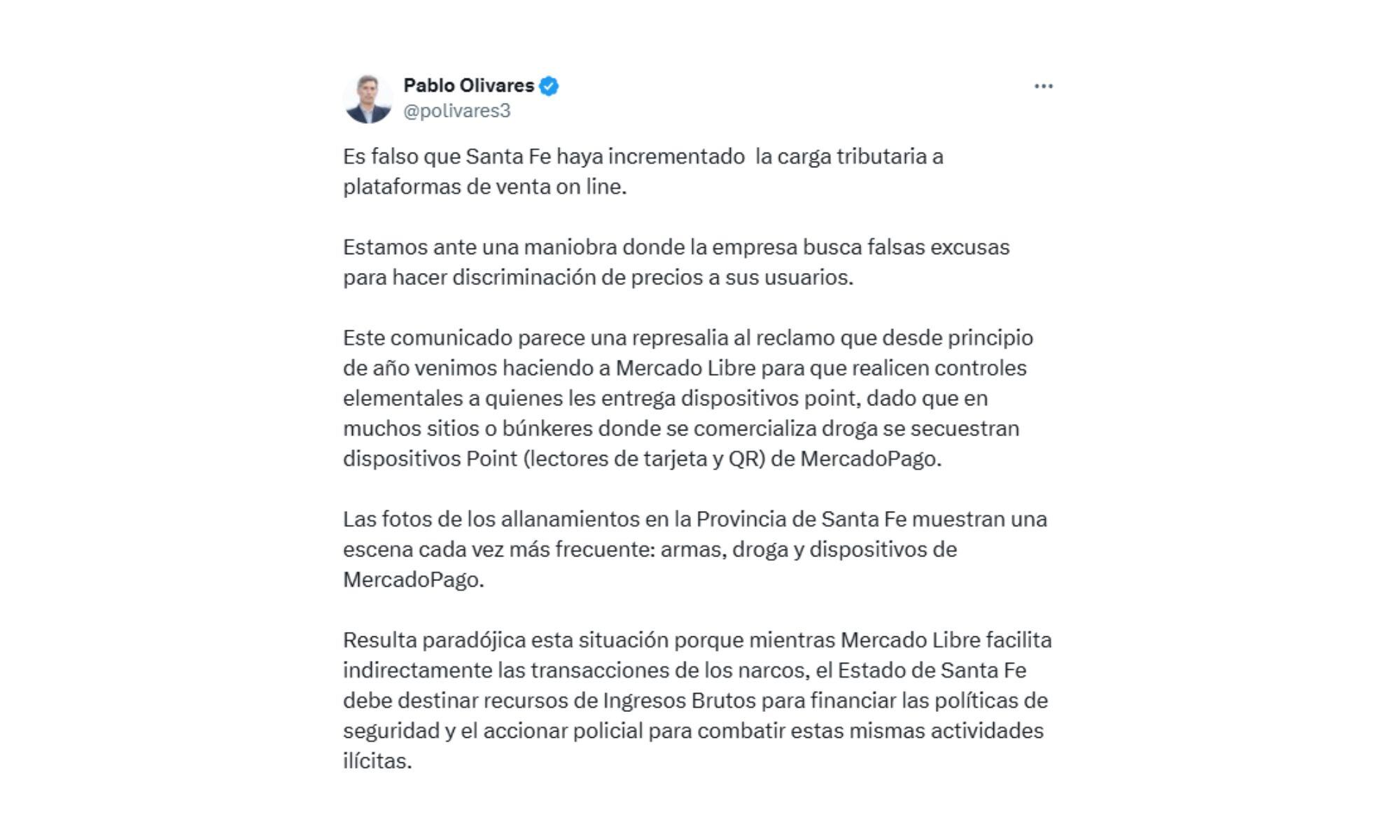 “Las fotos de los allanamientos en la Provincia de Santa Fe muestran una escena cada vez más frecuente: armas, droga y dispositivos de Mercado Pago”. Con esta afirmación, el ministro de Economía santafesino, Pablo Olivares, intensificó la disputa pública entre el gobierno provincial y la empresa Mercado Libre tras el anuncio de la plataforma de diferenciar la carga impositiva provincial y nacional en sus servicios de compra-venta y pagos digitales.