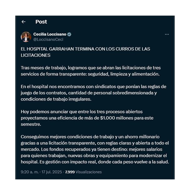 La viceministra de Salud de la Nación, Cecilia Loccisano, anunció este jueves la apertura de licitaciones en el Hospital Garrahan para las áreas de seguridad, limpieza y alimentación, al destacar que se proyecta “una eficiencia de más de $1.000 millones para este semestre”. Además, afirmó que los fondos recuperados “ya tienen destino: mejores salarios para quienes trabajan, nuevas obras y equipamiento para modernizar el hospital”.