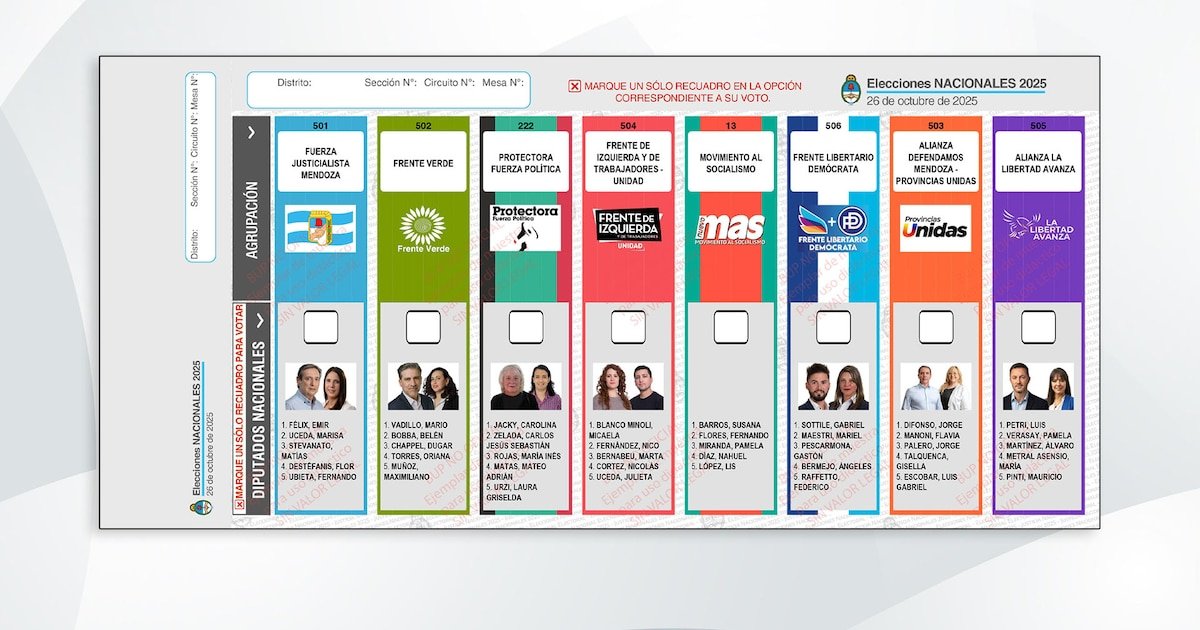 La Boleta Única de Papel de Mendoza para los comicios legislativos muestra a los principales candidatos de las 8 listas que se presentan.