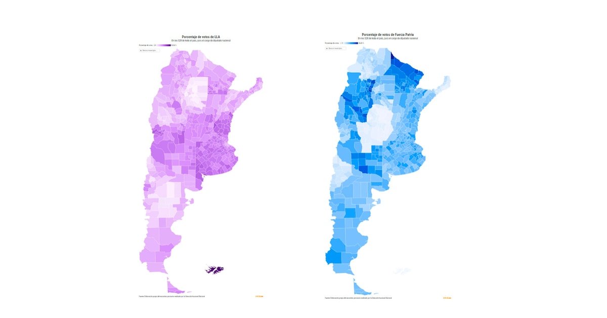 En el top five también aparece el municipio mendocino de Luján de Cuyo, donde la oferta libertaria sacó el 60,84% y triplicó los votos obtenidos por Fuerza Justicialista Mendoza (18,22%). En la provincia cuyana, LLA fue en alianza con el radicalismo gobernante de Alfredo Cornejo, y se impuso en el total provincial por 53,63%, el doble de lo que consiguió la versión local de FP (25,20%).