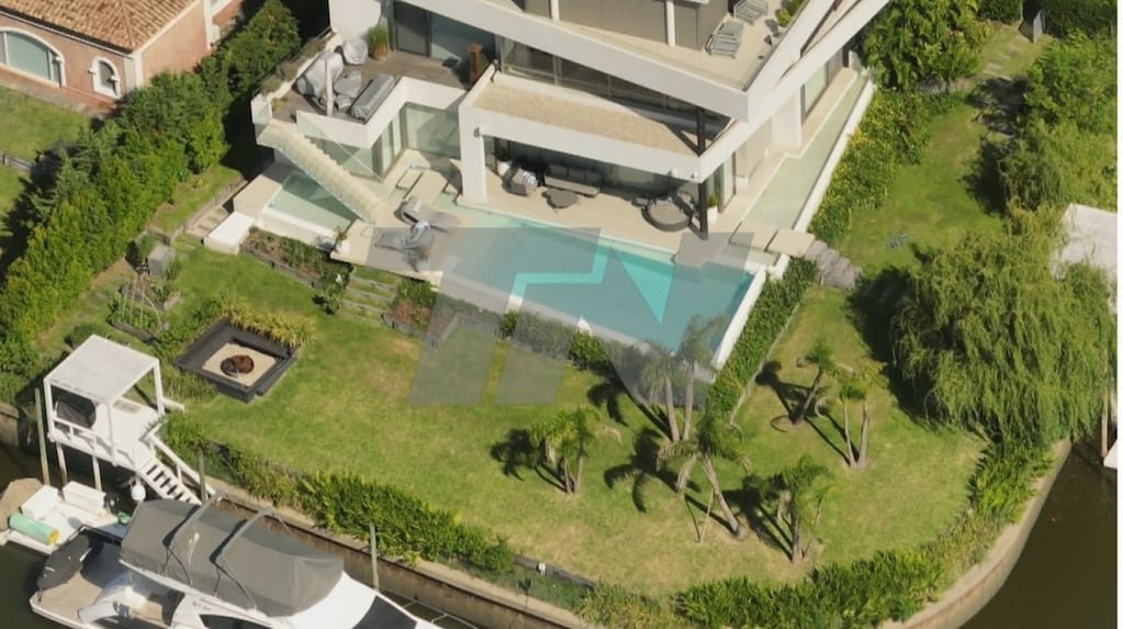 TN pudo acceder a imágenes aéreas de la propiedad ubicada en un barrio cerrado de Nordelta, en Tigre, en donde se puede ver una vivienda de amplias dimensiones, rodeada de jardines, con piscina y cerca de dos muelles con botes, motos de agua y lanchas.