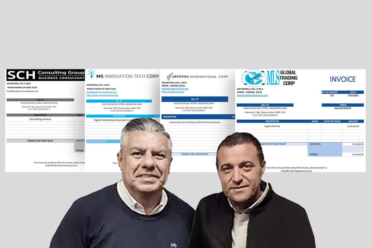 Esas cinco sociedades “pantalla” emitieron once facturas, por un total de 3.745.090 dólares. Previamente, la AFA ordenaba a los intermediarios pagar en presunta contraprestación por presuntos servicios genéricos como “campaña de marketing digital en redes de Internet” (Samtak y MS Innovation), “tercerización y consultoría de procesos administrativos” (Arcofisa), y “servicios de consultoría” (SCH Consulting y MLS Global). En las facturas nunca aparecen la cantidad de horas o el llamado Indicador Clave de Desempeño (KPI, por sus siglas en inglés), dos requisitos estándar en cualquier contratación corporativa transparente.