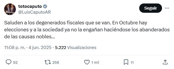 Otro de los que se expresó, fue el ministro de Economía, Luis Caputo: “Saluden a los degenerados fiscales que se van. En Octubre hay elecciones y a la sociedad ya no la engañan haciéndose los abanderados de las causas nobles…“.