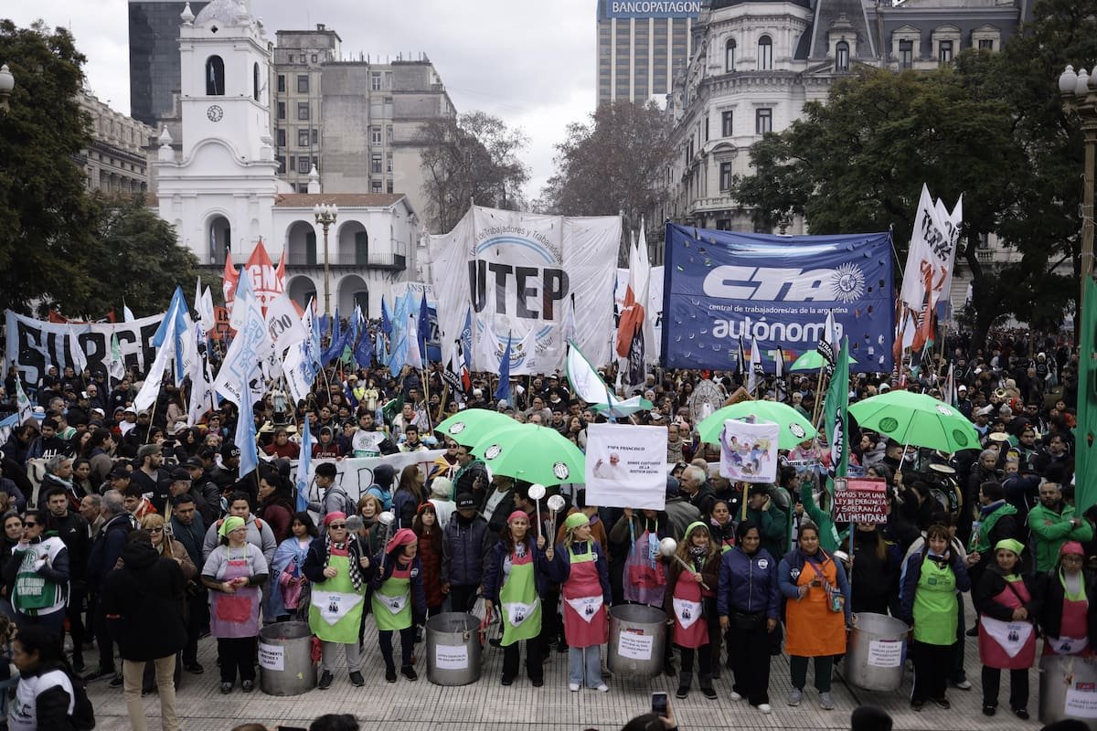 Bajo el lema “pan, paz, tierra, techo y trabajo”, organizaciones sociales y gremios se movilizaron esta tarde en el microcentro porteño en contra del ajuste del gobierno de Javier Milei, el desfinanciamiento de la política alimentaria y habitacional y en defensa del trabajo y la “soberanía nacional”. También repudiaron el veto presidencial al aumento jubilatorio, la “persecución judicial de Cristina Kirchner” y el protocolo antipiquetes aplicado por el Ministerio de Seguridad.