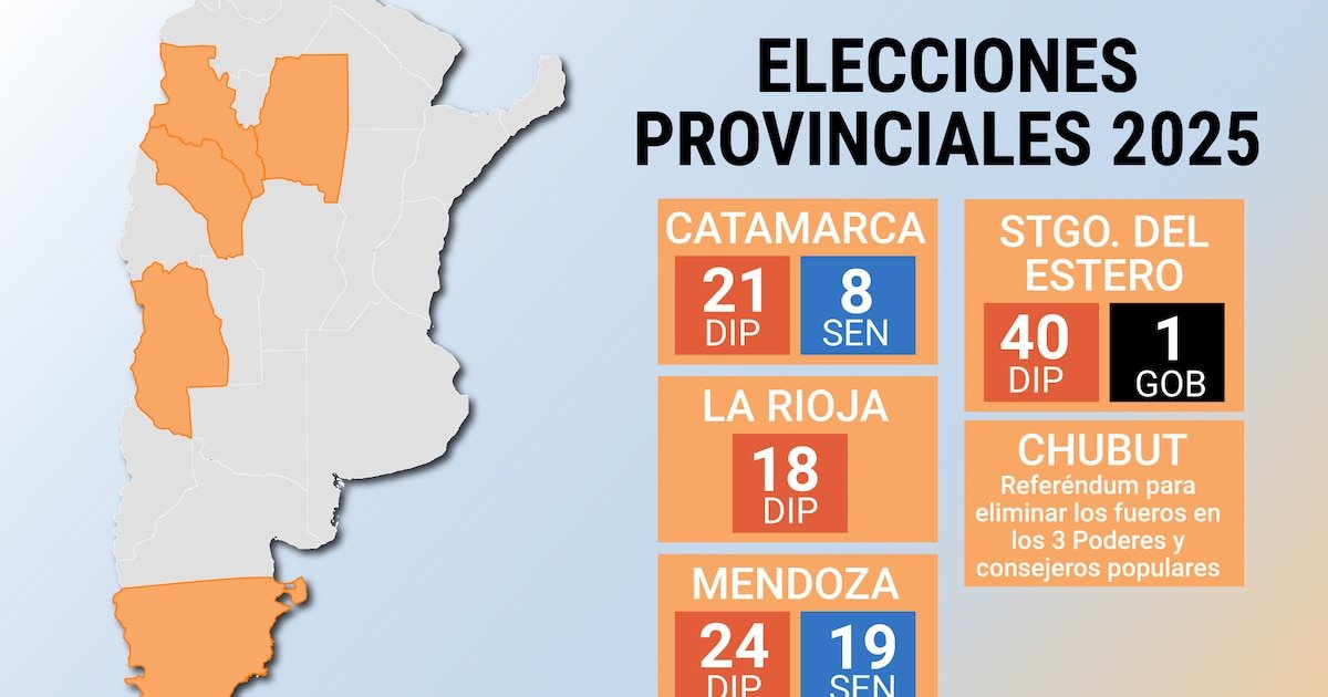 En Mendoza, Catamarca, La Rioja y Santiago del Estero se elegirán legisladores provinciales y, en algunos casos, también cargos municipales. En Catamarca, además, se renovarán los tres senadores que representan a la provincia, y en Santiago se vota un nuevo gobernador por los próximos cuatro años.