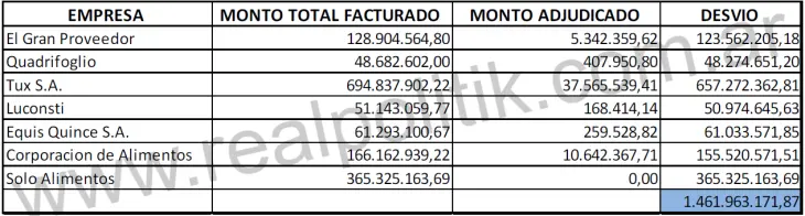 – El Gran Proveedor SRL: adjudicado por apenas 5,3 millones de pesos, terminó facturando 128,9 millones, con un desvío de más de 123 millones.