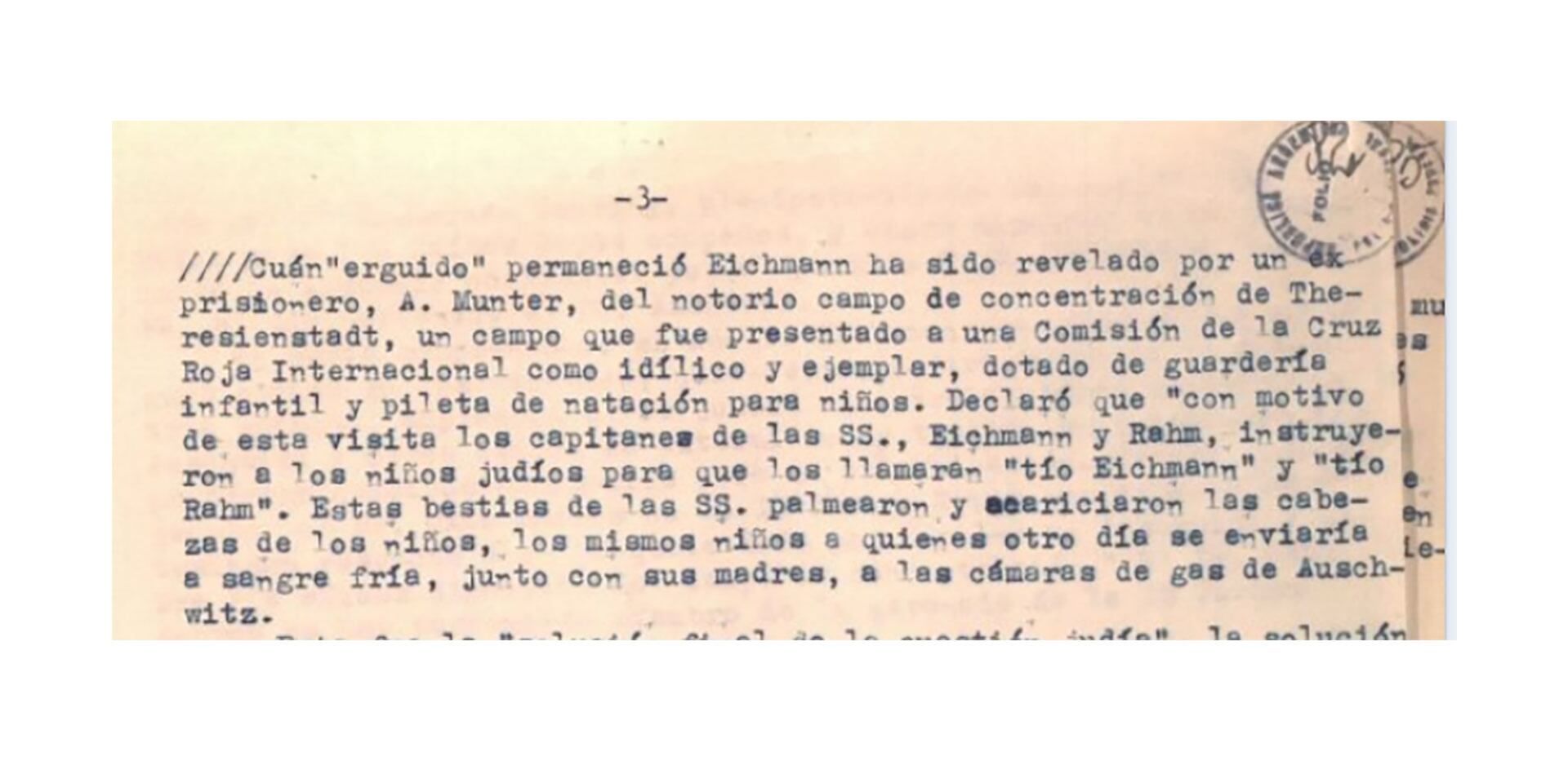 Según se lee en la transcripción de un documento del inglés titulado “Retrato de un asesino de masas”, el comandante del campo de Auschwitz, Rudolf Höss, de las SS, informó: “Ni bien llegaron los primeros trenes cargados de judíos, Eichmann impartió la orden del supremo comandante de las SS de que a los cadáveres deberían extraérseles los dientes de oro y a las mujeres cortárseles el cabello.”