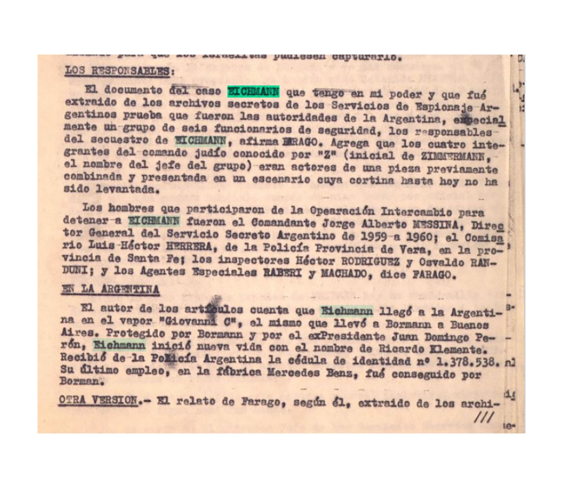 Un documento desclasificado y que fue extraído de los archivos secretos de los Servicios de Espionaje Argentino, revela el rol que se atribuyeron las autoridades de la Argentina, en el secuestro de Eichmann. Según se lee, los hombres que participaron de la Operación Intercambio para lograr la detención fueron el Comandante Jorge Alberto Messina, Director General del Servicio Secreto Argentino entre 1959 a 1960; el Comisario Luis Héctor Herrera, de la Policía Provincia de Vera, en la provincia de Santa Fe; los inspectores Héctor Rodriguez y Osvaldo Randuni; y los agentes especiales Raberi y Machado.