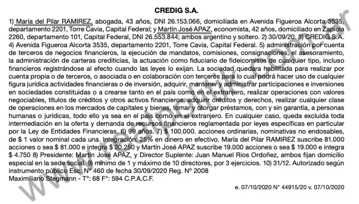 Credig SA, constituida el 30 de septiembre de 2020, tiene su domicilio legal en la lujosa Torre Cavia, en avenida Figueroa Alcorta 3535. Ramírez figura como accionista mayoritaria, con el 81 por ciento del capital social. El resto pertenece a Martín José Apaz, un economista que fue designado presidente y también pasó de ser empleado de la Cámara de Diputados de la provincia de Buenos Aires a empresario de primer nivel, hoy conduciendo APOLA SA junto a María Belén Olaiz. El objeto social de la empresa de la histórica trabajadora del estado incluye asesoramiento financiero, actuación como fiduciario, otorgamiento de préstamos y participación en otras sociedades, incluso en el extranjero.