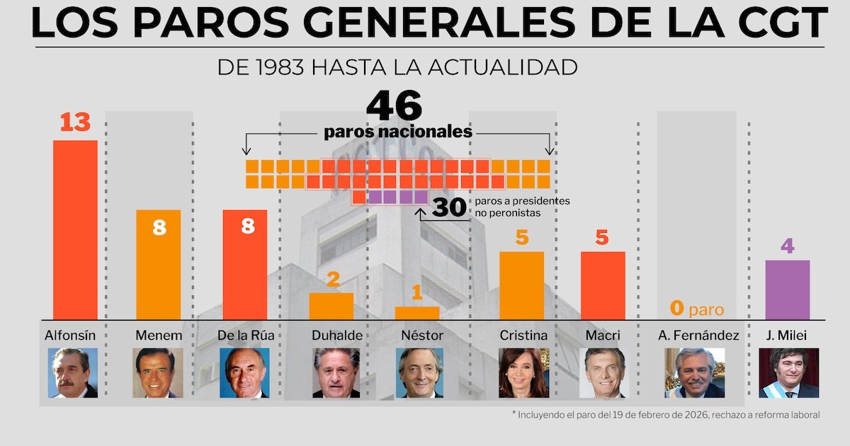 Raúl Alfonsín fue el jefe de Estado que más paros sufrió, con 13 durante su mandato. Le siguen Carlos Menem y Fernando De la Rúa, ambos con 8. Cristina Kirchner y Mauricio Macri registraron 5, mientras que Duhalde y Néstor Kirchner sumaron dos y uno, respectivamente.