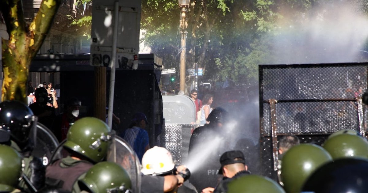 La situación, en principio calma, cambió abruptamente cuando una de las vallas dispuestas por las fuerzas de seguridad se desplazó. Esto permitió que algunos asistentes intentaran acercarse al perímetro, generando la reacción inmediata de la Policía Federal, la Gendarmería y la Prefectura, que se desplegaron para aplicar el protocolo antipiquete.