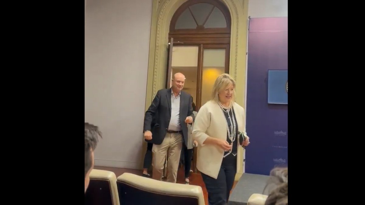 En un video difundido en redes se observa el ingreso a la sala de conferencia de prensa de la Casa Rosada de los ministros Alejandra Monteoliva (Seguridad), Luis Caputo (Economía), Federico Sturzenegger (Desregulación), y Pablo Quirno (Relaciones Exteriores). Todos se ubicaron en primera fila.
