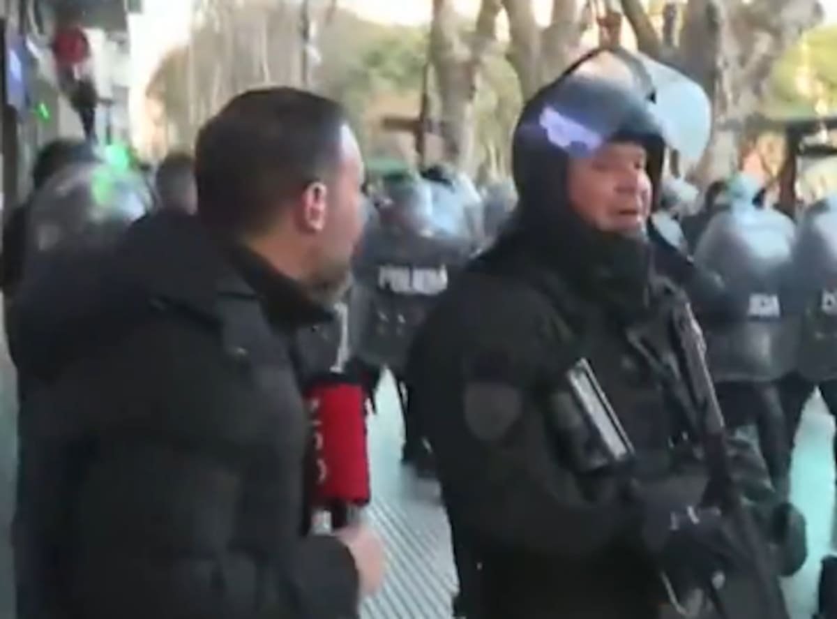 Las imágenes de la transmisión captaron el momento en el que, mientras Munafó se acercaba al cordón policial -que avanzaba en dirección a donde estaban los periodistas-, un efectivo se metió en la escena y le disparó a pocos metros de distancia. “¿Qué hacés? ¿Qué me tirás, cagón?“, le recriminó al agente de seguridad, quien se tapó la cara con su casco. Por su parte, uno de sus compañeros lo apartó del lugar.
