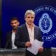 Argentina’s Economy Minister Luis Caputo and Central Bank’s President Santiago Bausili arrive for a press conference following a staff-level agreement with the International Monetary Fund (IMF)...