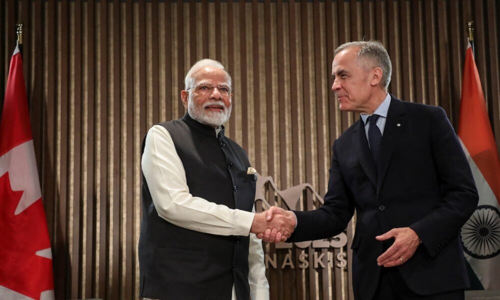 El primer ministro indio, Narendra Modi, estrecha la mano del primer ministro canadiense, Mark Carney, durante una reunión bilateral celebrada en el marco de la Cumbre...