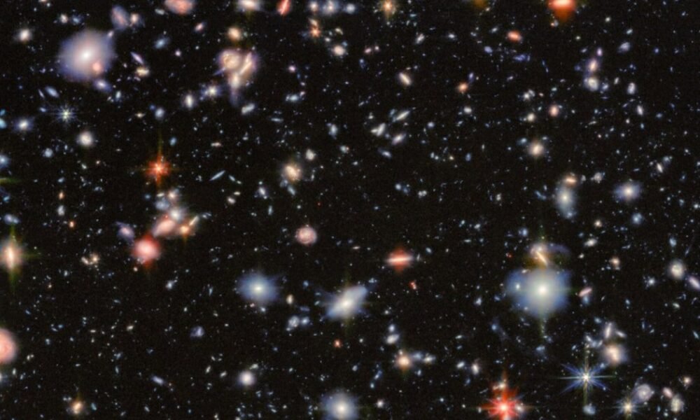 Sextans A se encuentra a unos cuatro millones de años luz y contiene solo entre el 3 % y el 7 % del contenido metálico del...